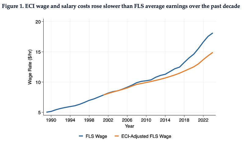 Our report emphasizes that the Farm Labor Survey has led to rapidly rising AEWRs. In most regions, FLS-based AEWRs rose more compared with AEWRs constructed with alternative data sources. Figure 1 in the report demonstrates this by comparing national FLS wage growth with wage growth according to the Employment Cost Index (ECI) for all wage and salary workers. ECI-Adjusted FLS wages are constructed by applying the annual ECI to the base FLS wage in 2001.